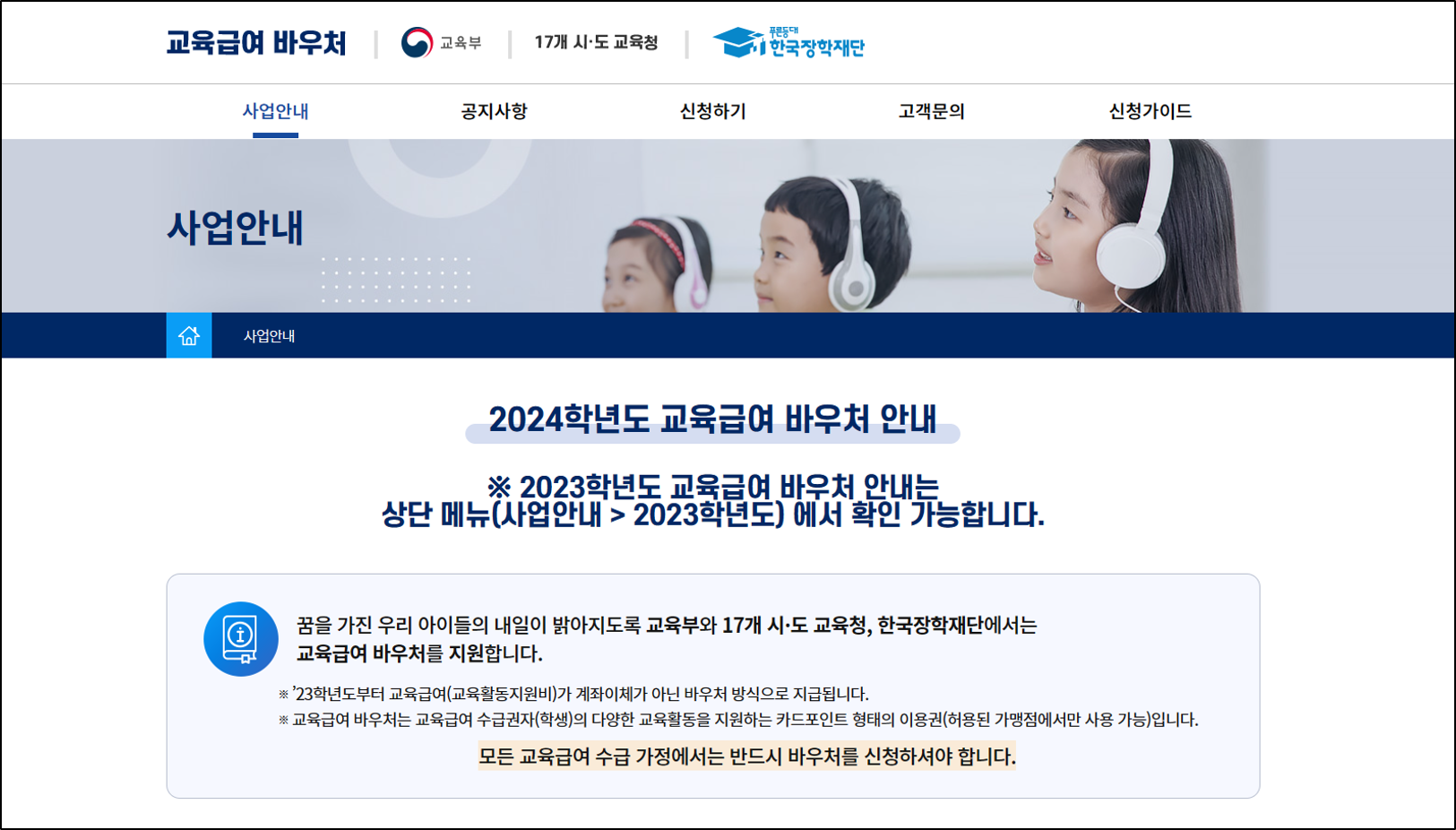교육부와 17개 시도 교육청, 그리고 한국장학재단에서 지원하는 교육급여 바우처사업이 시행되고 있습니다.