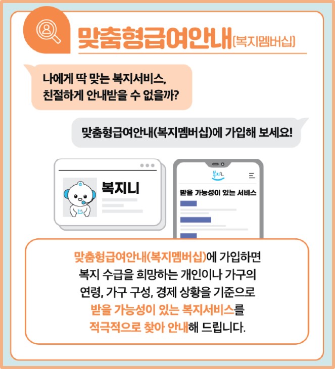 - 맞춤형 급여안내(복지멤버십) : 내가 받을 수 있는 복지혜택을 생애주기별로 맞춤형으로 안내해 드립니다.